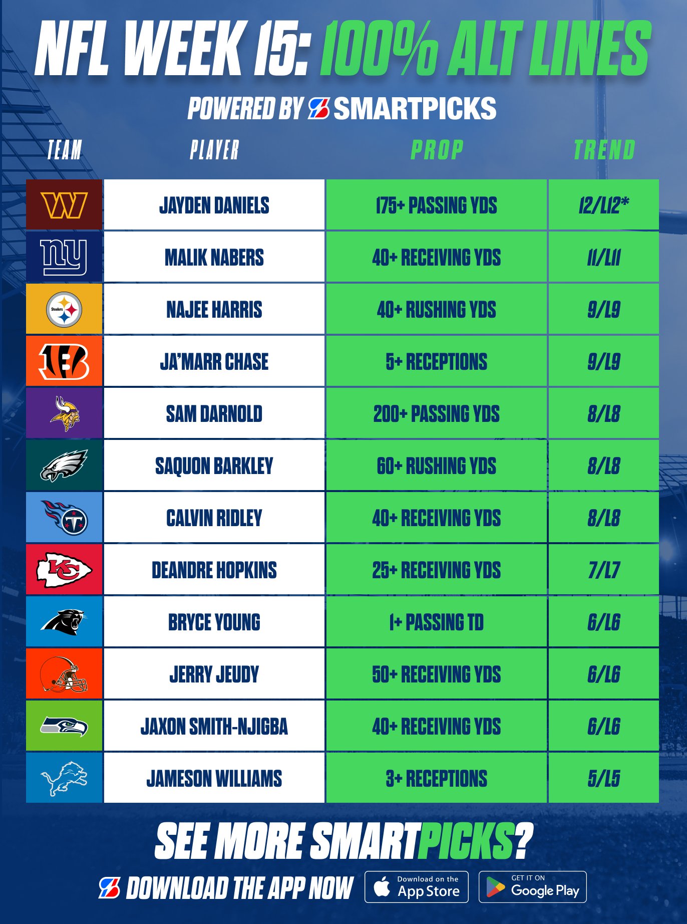 SmartPicksโก๏ธ on X: "NFL Sunday Cheat Sheets ๐ฅ๐ Week 15 | December 15th โ๏ธ ๐ NFL 100% Alt Lines ๐ NFL Mismatches ๐ NFL 100% TD Streaks All found with the SmartPicks